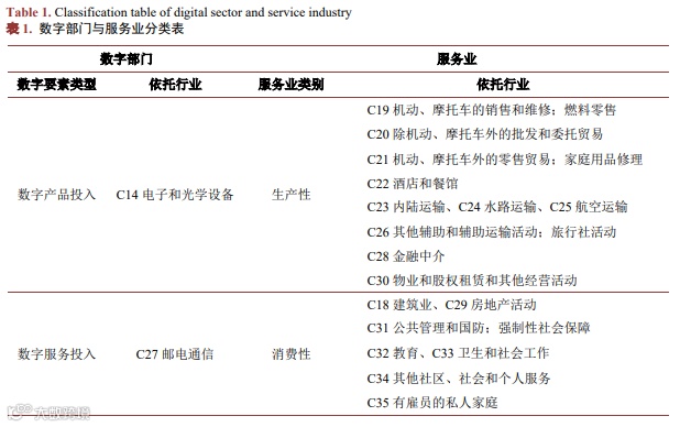 由于本文研究区间为2014~2021年,采用ADB-MRIO发布的62国35行业(C01~C35)现价版本的多区域投入产出表作进行计算。如表1所示,对服务业列表、数字部门进行分类,本文将C14电子和光学设备、C27邮电通信定义为狭义的数字部门。