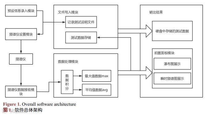本软件的架构可以主要分为预设信息录入模块、频谱仪设置模块、数据收集模块、数据处理模块、文件写入模块和前置面板展示模块。图 1 展示了软件总体的框架。