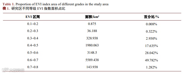 表 1 显示,绝大部分区域多年平均植被指数在 0.4~0.7 区间内,占总区域面积的 95.459%。其中植被指数在 0.6~0.7 之间的地区在研究区占比最大,约为 49.782%,其次是植被指数在 0.5~0.6 的地区,约占研究区的 28.042%,植被指数在 0.4~0.5 的地区约占研究区的17.635%。而植被指数在 0.4 以下或 0.7以上的地区占比较少,加起来不到 5%。表明研究区年均 EVI 值分布情况较为良好。