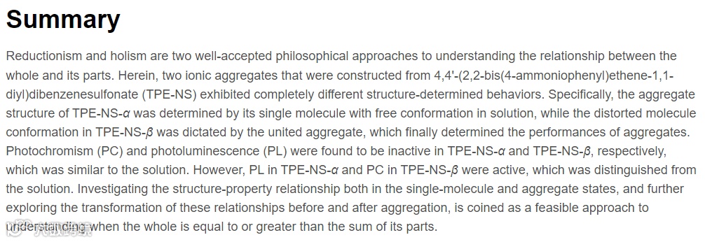 近日,中国学者在细胞出版社(Cell Press)旗下期刊Matter上发表了题为“整体等于抑或大于部分之和?分子与聚集体的异同”的研究论文。作者利用一种含铵根和磺酸根的双离子型四苯基乙烯衍生物 TPE-NS分子(部分)生长了 α和β 两种晶体(整体),揭示了体系中新颖而奇特的部分与整体的关系。