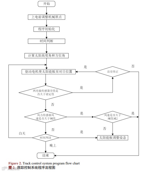 控制部分系统原理如图 2 所示,利用 PLC 控制,在太阳能板两侧同一水平线上放置两个光敏传感器,以减小视日轨迹跟踪时计算的误差,可根据各地情况手动设定传感器二者差值的阈值,当在阈值范围内时,程序根据视日轨迹自动跟踪。当超出阈值时,程序通过传感器修正太阳能板姿态使之回到阈值范围内,之后继续根据视日轨迹跟踪。