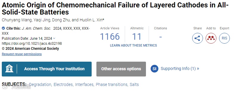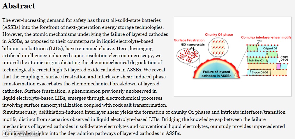 相关研究成果以Atomic Origin of Chemomechanical Failure of Layered Cathodes in All-Solid-State Batteries为题发表在《美国化学会志》(JACS)上。