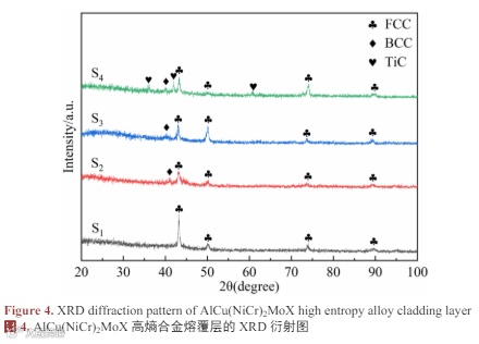 图 4 为 AlCu(NiCr)2MoX (X = Ti、C、Ti 与 C)高熵合金熔覆层的 XRD 衍射图。由图可知,AlCu(NiCr)2Mo(S1)高熵合金熔覆层组织由面心立方(FCC)结构的单一固溶体相组成,未形成其他相,结构相对简单,这是由于 Cu (128 pm)、Ni (125 pm)、Cr (128 pm)具有相近的原子半径,可以形成无序的 FCC 单一固溶体相,由此表明 AlCu(NiCr)2Mo 高熵合金具有较高的热稳定性。