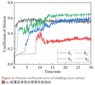 图 6 为 AlCu(NiCr)2MoX 高熵合金熔覆层表面的摩擦系数曲线。由图可知,熔覆层在摩擦磨损试验过程中经历了跑合磨损阶段和稳定磨损阶段两个阶段。
