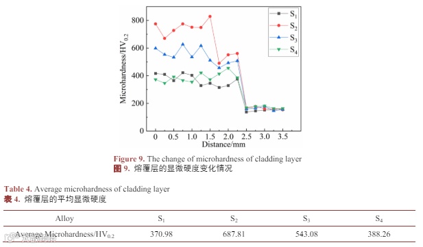图 9 为 AlCu(NiCr)2MoX 高熵合金熔覆层截面从熔覆层顶部余高开始,经过熔合线直至基体的显微硬度变化情况,表 4 为熔覆层的平均显微硬度。由图可知,AlCu(NiCr)2Mo(S1)和 AlCu(NiCr)2MoTiC(S4)熔覆层的显微硬度变化较为平稳,平均显微硬度分别为 370.98 HV0.2、388.26 HV0.2,硬度较低。AlCu(NiCr)2MoTi(S2)和 AlCu(NiCr)2MoC(S3)熔覆层的显微硬度变化幅度较大,平均显微硬度分别为 687.81 HV0.2、543.08 HV0.2。