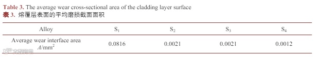 表 3 为 AlCu(NiCr)2MoX 高熵合金熔覆层表面的平均磨损截面面积,图 7 为对应高熵合金熔覆层表面摩擦磨损测试的磨损率。由图可知,AlCu(NiCr)2MoTi(S2)和 AlCu(NiCr)2MoC(S3)高熵合金熔覆层表面的磨损率相等,由于S2和S3中 BCC相的生成增加了其强度,磨损率相比 AlCu(NiCr)2Mo(S1)减少 97.43%,耐磨性有所提高。AlCu(NiCr)2MoTiC(S4)高熵合金熔覆层表面的磨损率相比 S1减少 98.53%,磨损率最低,耐磨性最佳,这得益于 BCC 相及 TiC 硬质相的生成。