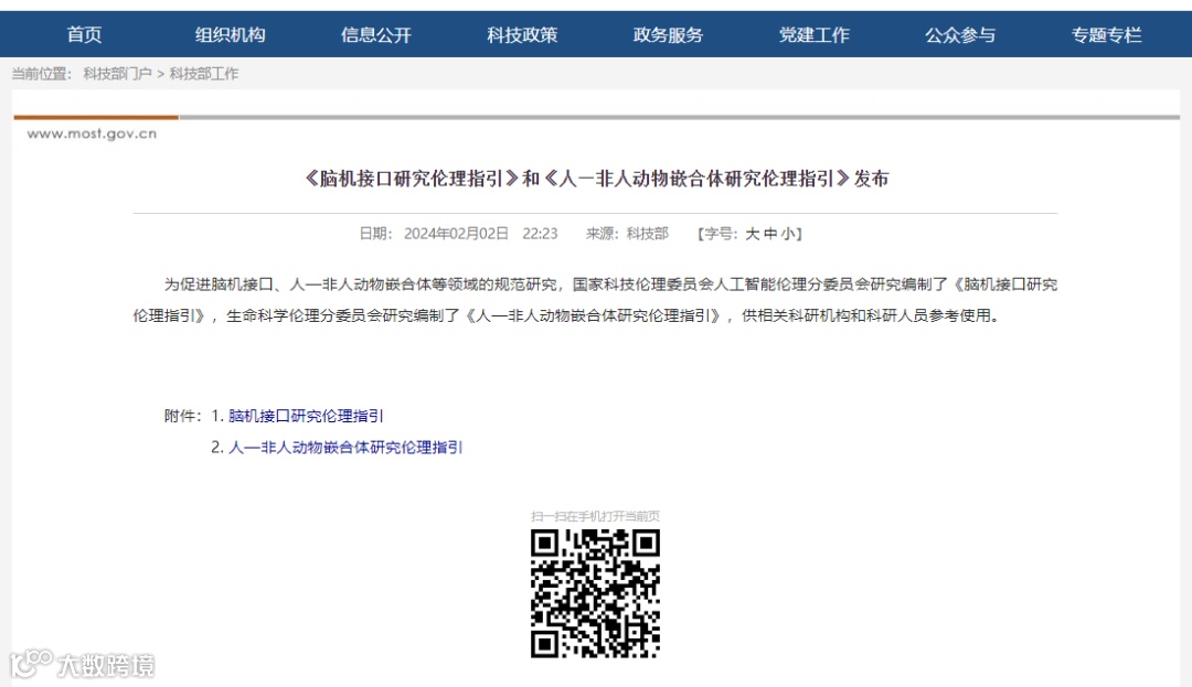 为促进脑机接口、人-非人动物嵌合体等领域的规范研究,国家科技伦理委员会人工智能伦理分委员会研究编制了《脑机接口研究伦理指引》,生命科学伦理分委员会研究编制了《人—非人动物嵌合体研究伦理指引》,供相关科研机构和科研人员参考使用。