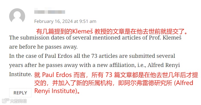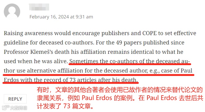 撤稿观察并不完全赞同这位网友的观点,撤稿观察的编辑在文章中写道:“该论文于2023年5月提交,也就是在Klemeš去世几个月后,但有可能是在他去世之前完成并首先提交给其他期刊,或者是搁置数月后才提交到了发表该论文的期刊。”