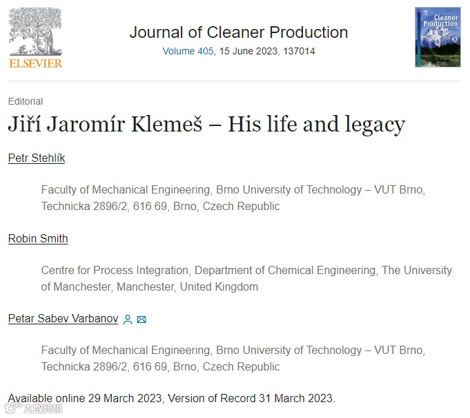 但引人瞩目的是,Klemeš去世后的大部分论文都发表在了Elsevier旗下的期刊上。这其中 Energy (IF=8.9)和 Journal of Cleaner Production (IF=11.1)是拥有最多未提及Klemeš已去世论文的期刊。但很有趣的是,Klemeš生前曾是这两本期刊的编辑。他是 Energy的主题编辑,Journal of Cleaner Production的共同主编。并且Journal of Cleaner Production曾在2023年3月发表一篇悼念Klemeš的社论: