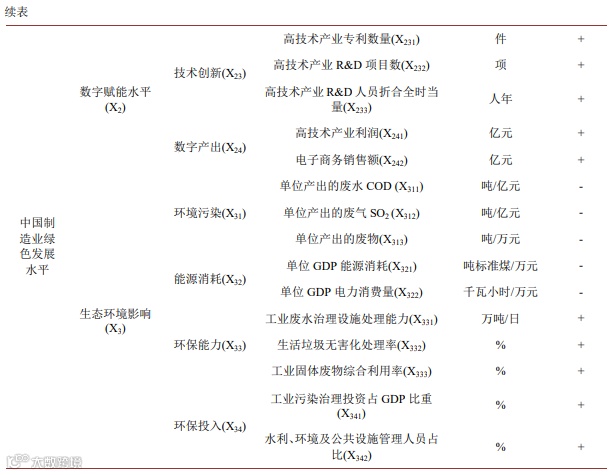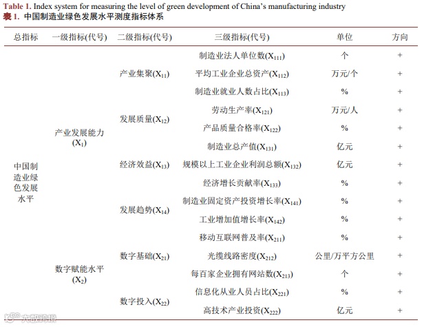 本文构建了中国制造业绿色发展水平测度的指标体系,一、二级指标名称及代号、三级指标名称及代号、单位和方向如表 1 所示。