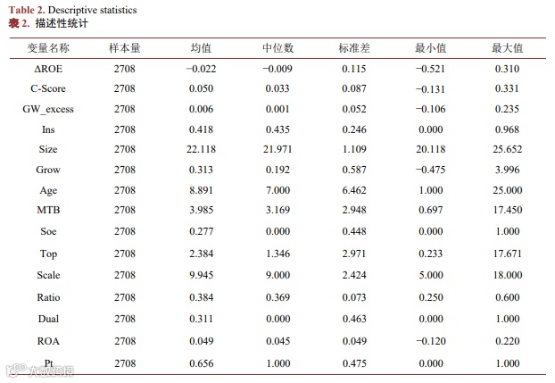 模型主要变量的描述性统计如表 2 所示。ΔROE 的均值为−0.022,最小值为−0.521,最大值为 0.310,说明企业并购后整体绩效表现不佳,净资产收益率下降且变化幅度存在显著差异。C-Score 的均值为 0.050,最小值为−0.131,最大值为 0.331,表明会计稳健性整体处于较低水平且存在较大差异。GW_excess 的均值为 0.006,中位数为 0.001,表明部分企业存在较高超额商誉。Soe 的均值为 0.277,表明非国有企业主导的并购居主导地位。Pt 的均值为 0.656,表明选择现金支付方式的并购数量多于其他方式。