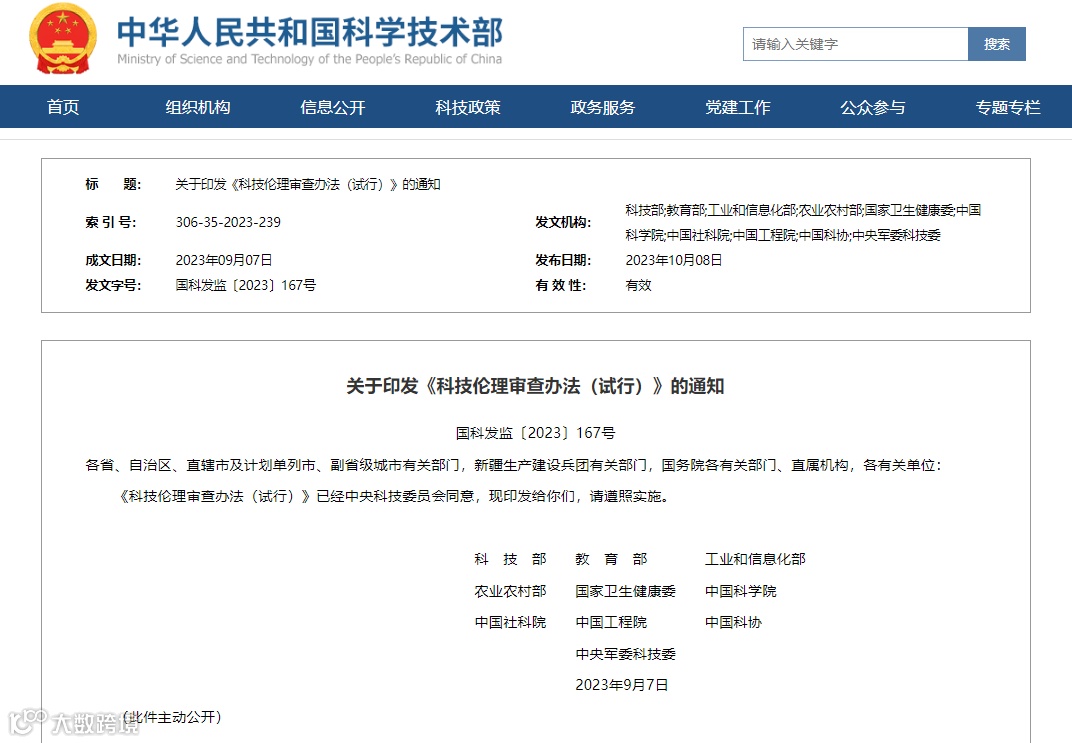 《科技伦理审查办法(试行)》原文链接:https://www.most.gov.cn/xxgk/xinxifenlei/fdzdgknr/fgzc/gfxwj/gfxwj2023/202310/t20231008_188309.html