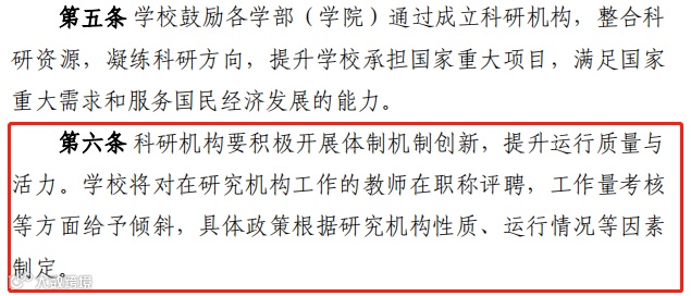 《大连理工大学科研机构管理办法(修订)》则提出,科研机构要积极开展体制机制创新,提升运行质量与活力。学校将对在研究机构工作的教师在职称评聘,工作量考核等方面给予倾斜,具体政策根据研究机构性质、运行情况等因素制定。