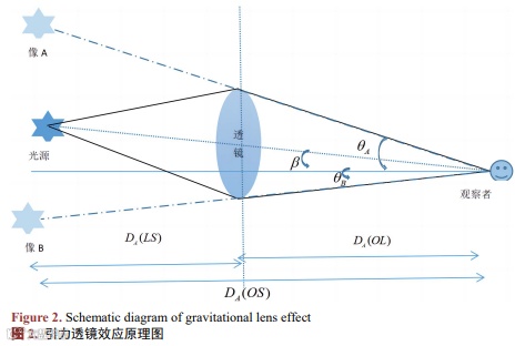 引力透镜效应是由于背景源光线(或辐射)通过大质量天体(比如星系或星系团)时,由于引力引起的偏折或会聚现象。光线通过不同的路径,使得背景源在透镜周围形成多幅像,光源越远,像扭曲得越厉害,如图2所示。类星体的亮度常常变化,如果它在引力透镜下生成两个像,由于每个像的光走过的路程不同使得光到达地球的时间不同,利用时差就可以用来估计透镜距离。如果星系距离太远,暗到无法拍摄光谱,就可以用引力透镜来测量可观测宇宙学尺度上的时间延迟,从时间延迟推导出哈勃常数。