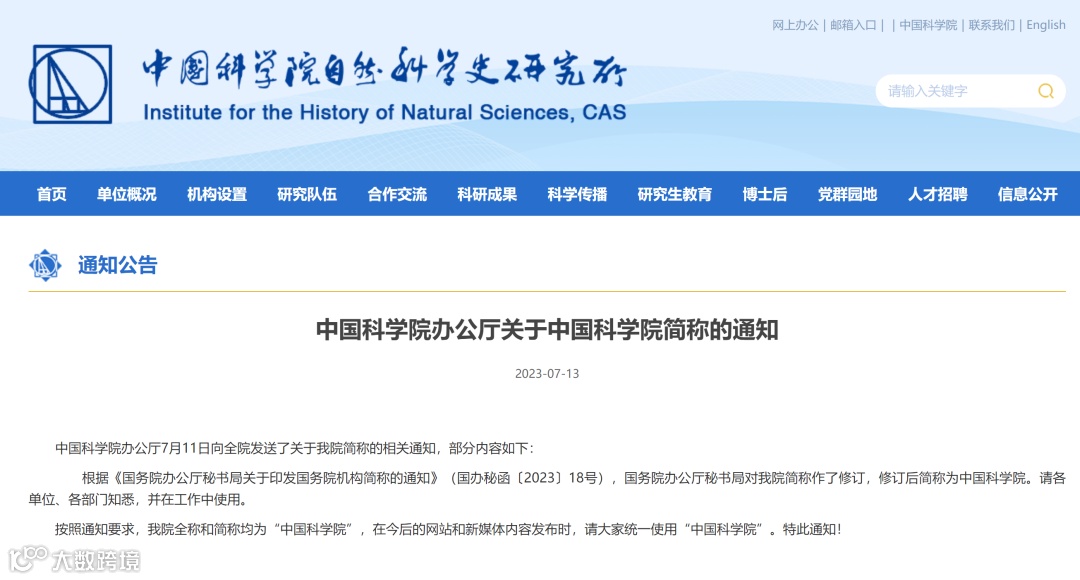 7月13日,中国科学院自然科学史研究所网站发布消息称,中国科学院办公厅7月11日向全院发送了关于中国科学院简称的相关通知,部分内容如下: