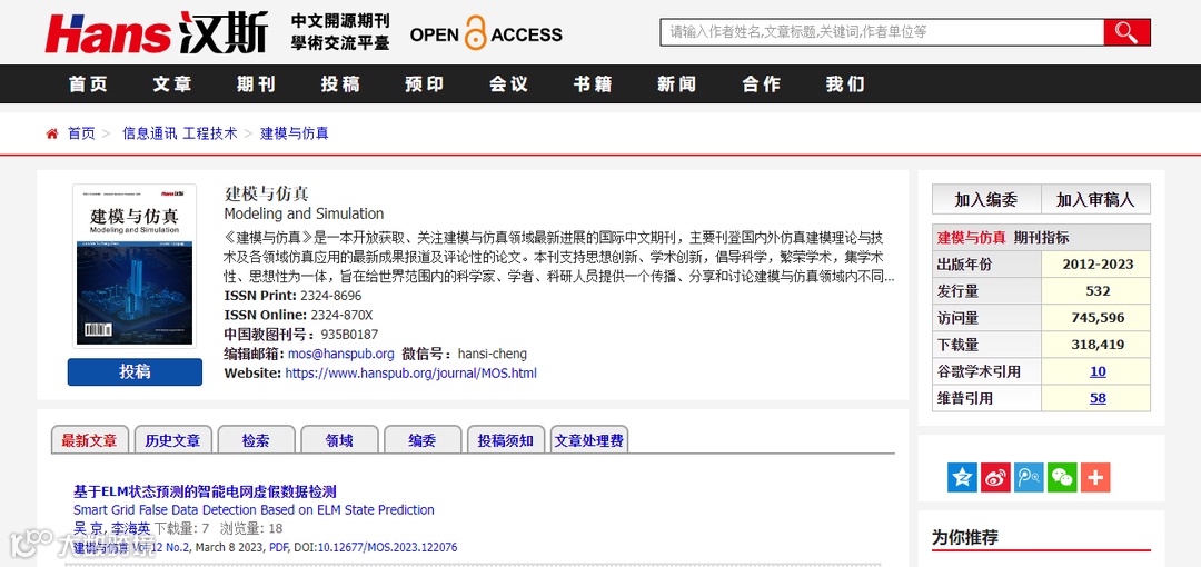 截至2022年11月,据维普中文期刊服务平台统计,《建模与仿真》期刊文章被引量:58,H指数:3。