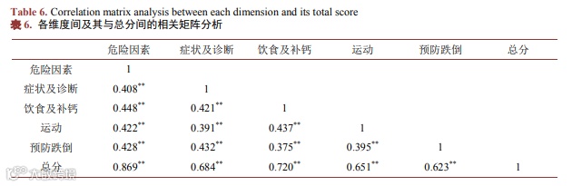 本问卷包含五个维度:危险因素、症状及诊断、饮食及补钙、骨骼与运动、预防跌倒五个维度组成,包括24条题目,总分24分。首先通过项目分析,将区分度不高的条目予以剔除,然后通过探索性因子分析将因子载荷低0.5的问卷项目剔除。问卷各维度得分的因子负荷值介于0.65~0.82之间,与预期维度划分一致,效度良好。内部相关性上,五个维度得分与总分之间的相关性(0.62~0.87)明显高于各方面之间的相关性(0.37~0.44),说明了问卷的各维度问题都反映了“骨质疏松一般知识”这个中心。本量表预调查问卷中各因子所代表的分量表的Cronbach’s α信度系数均在0.7以上,总量表Cronbach’s α系数0.918,问卷的信度理想。