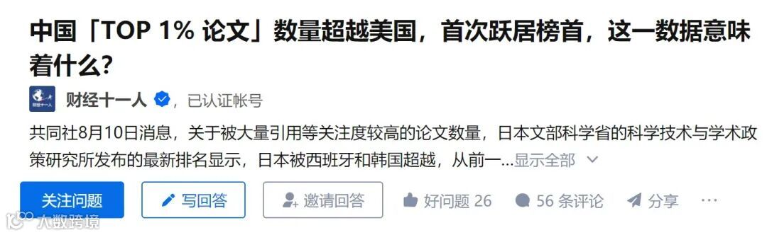 近日,一则“中国「TOP 1%论文」数量超越美国,首次跃居榜首,这一数据意味着什么?”的话题在网上引起热议。
