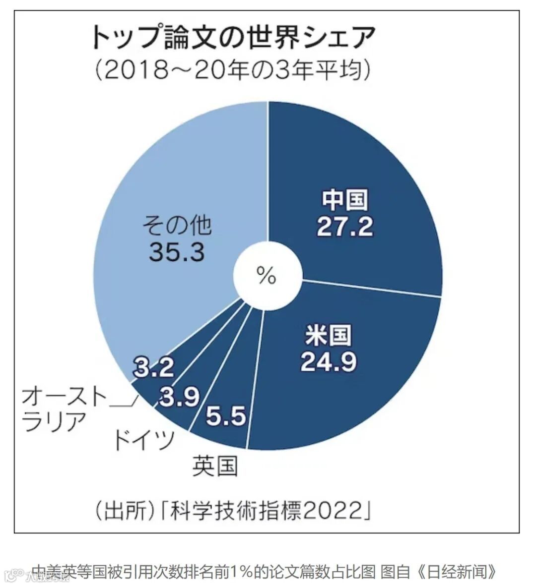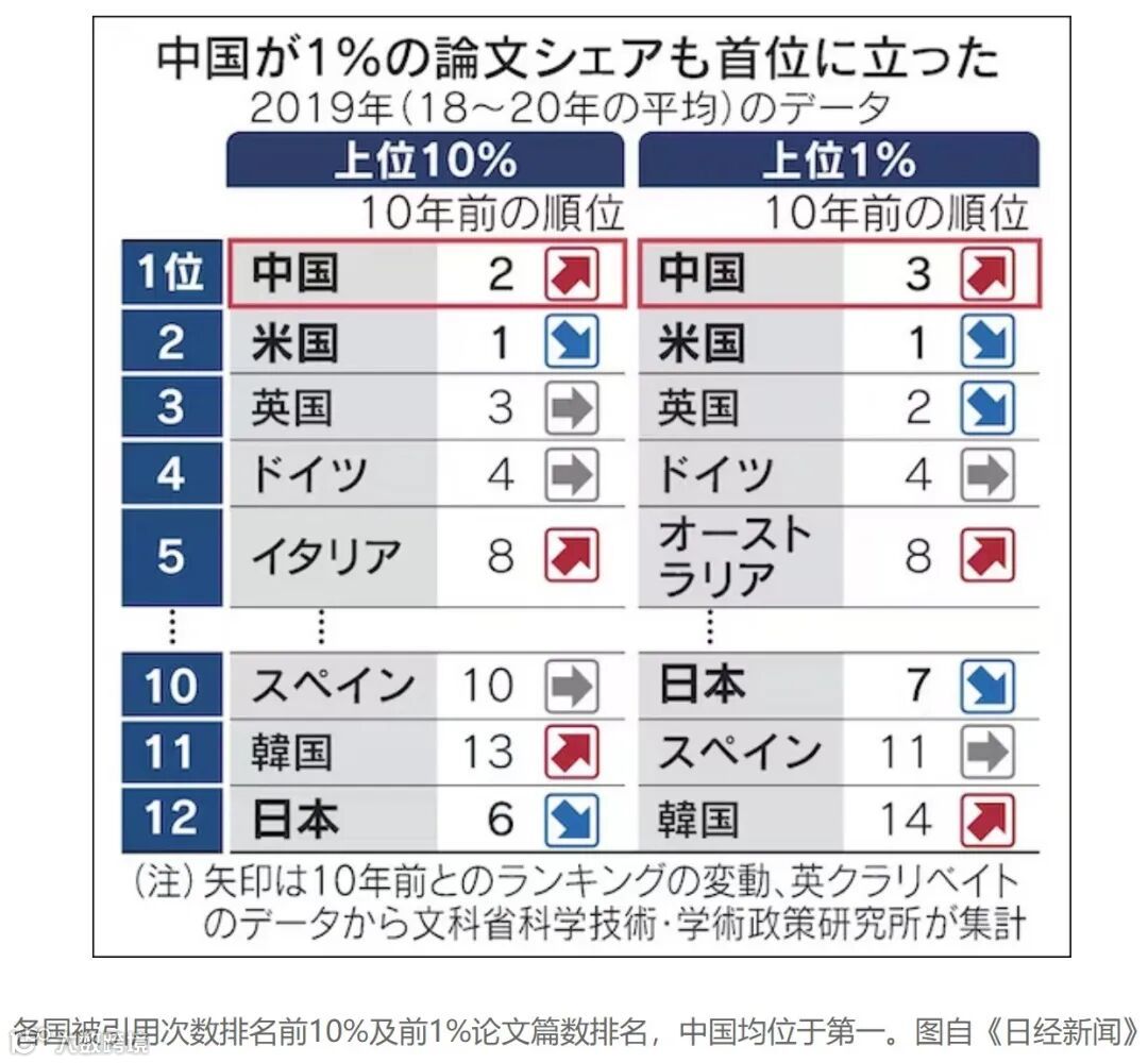 研究论文被其他研究人员引用的次数越多,就被认为质量越高,被引用次数排名前1%的论文可称之为“TOP1%论文”,是相关领域中最卓越的研究成果。在此次日本的研究数据上,中国的“TOP1%论文”篇数占比为27.2%(4744篇),首次超过占24.9%(4330篇)的美国,且明显超过第三名英国的5.5%。日本排名第十。