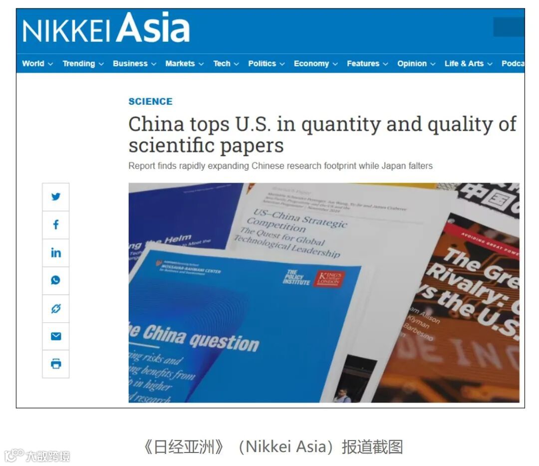 《日经新闻》称,(一个国家)如果在学术研究上占据优势,产业竞争力的逆转也将日趋带有现实意味,通过战略性地投入人力和资金,中国正朝着到2050年成为与美国并驾齐驱的“科技强国”之目标稳步前进。