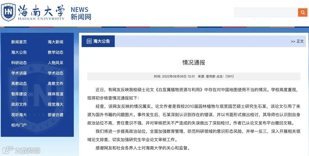 日前,海南大学发布情况通报:该校硕士论文《白芨属植物资源与利用》中存在对中国地图使用不当的情况。学校高度重视,经初步核查,校方认为该网友反映的情况属实。