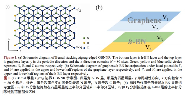 论文研究的石墨烯/h-BN异质结是由单层石墨烯和单层h-BN通过范德瓦尔斯力结合而成。异质结的顶层为石墨烯层,底层为h-BN层,这种堆叠最稳定的构型为Bernal堆叠,即一个碳原子位于硼原子顶部,而另一个碳原子位于h-BN环中心上方。GBNNR中y为周期性方向,x为开边界方向包含40条锯齿链(即N=80个格点)。局域势V1和V2分别施加在石墨烯层的上半部分和下半部分,V3和V4分别施加在h-BN层的上半部分和下半部分。