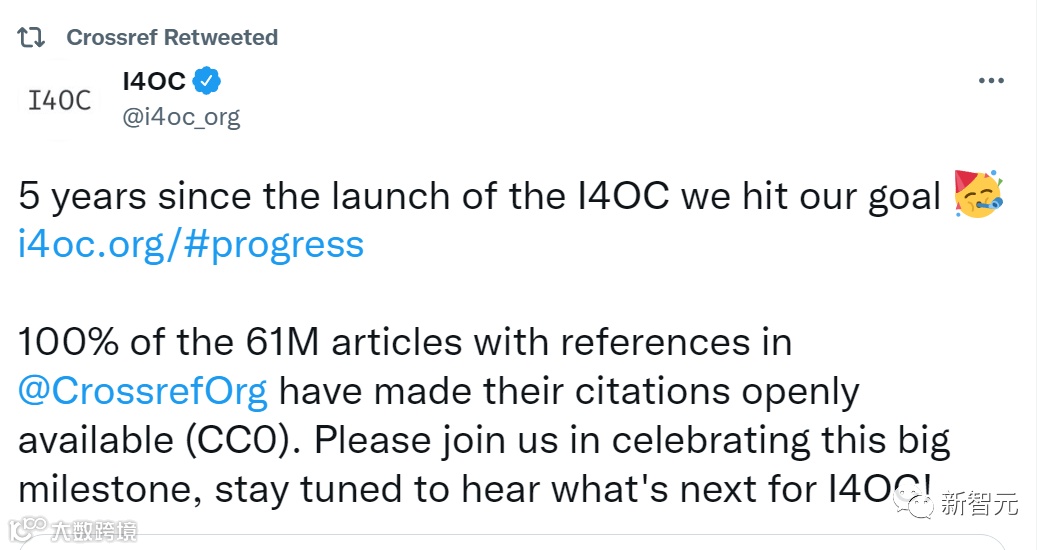 8月18日,Crossref在Twitter上宣布的这一里程碑,是2017年发起的开放引用倡议(Initiative for Open Citations,I4OC)5年来努力的结果。