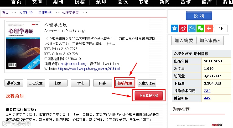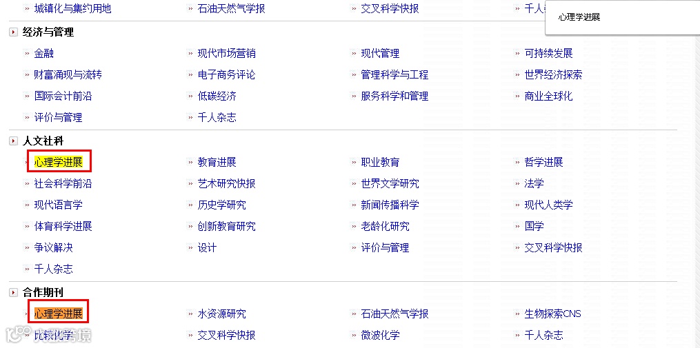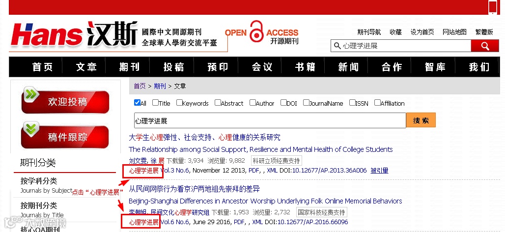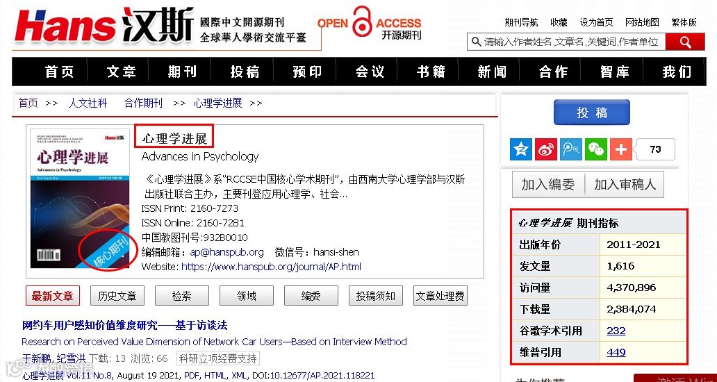 如果一本期刊为核心期刊,在我们汉斯出版社官网中都会被明确标出。以《心理学进展》期刊为例,我们一起来检索吧!