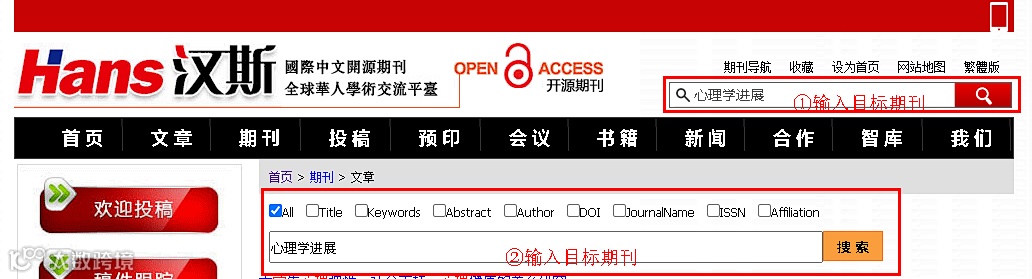 在①或②处搜索目标期刊,如“心理学进展”,就可看到下图的搜索结果,如图一。点击红框内“心理学进展”几个字即可进入期刊首页,如图二。