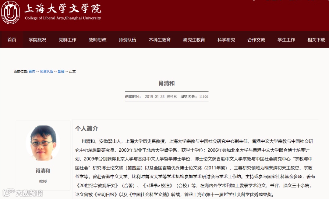 据上海大学文学院官网显示,肖清和现为上海大学历史系教授(正高),也是上海大学宗教与中国社会研究中心副主任。