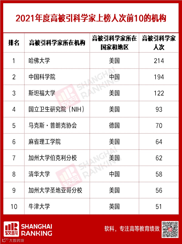 中国科学院入选科学家数量排名全球机构第2位,清华大学从2018年排名第19位上升到今年的第8位。