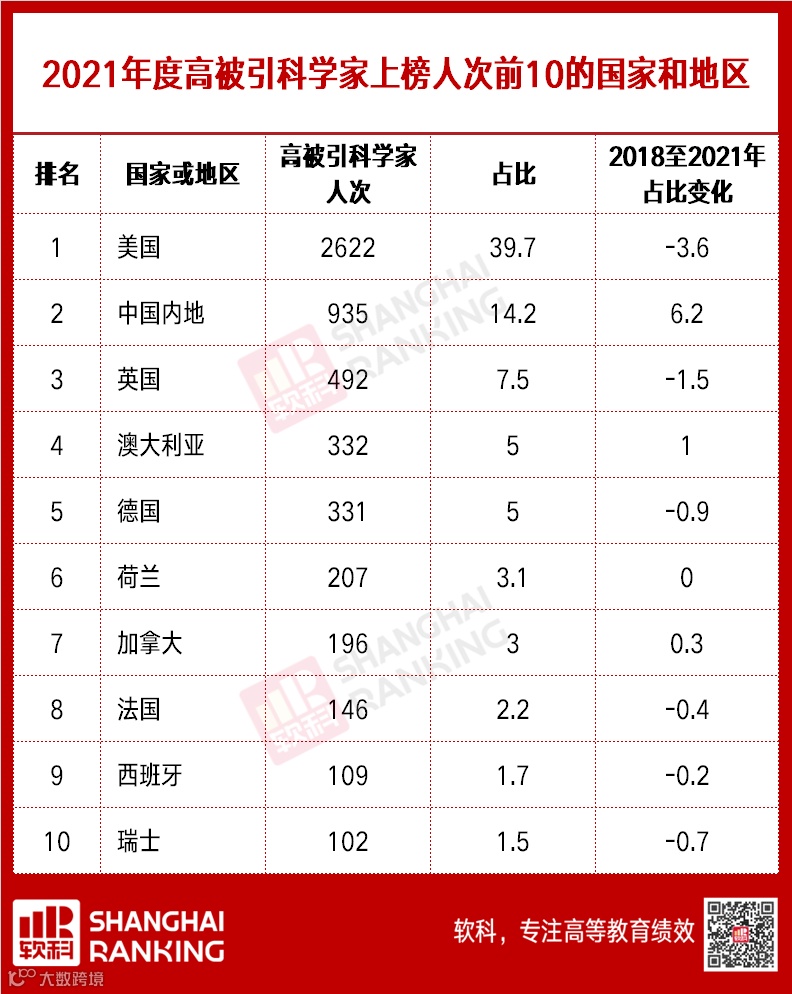 中国内地今年排名第二,共有935人次入选,占比14.2%,远高于2018年的7.9%。四年来,中国内地科学家在高被引科学家名单中所占比例几乎翻了一番。