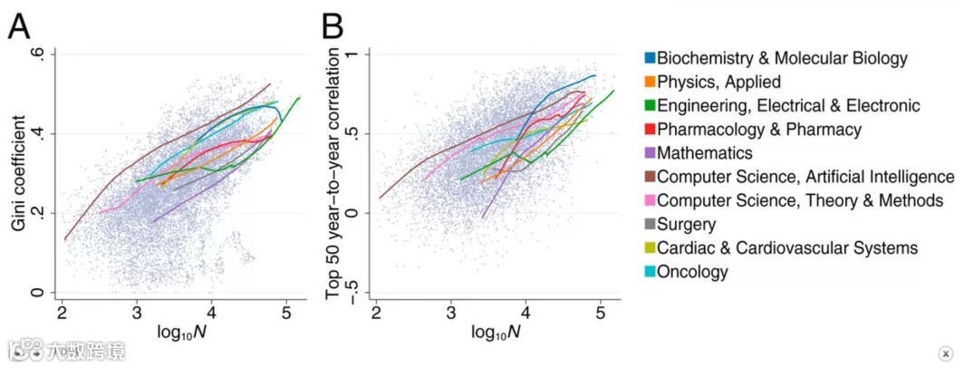 注:每个点代表一篇论文,左图指对数处理的某领域该年的总论文数(横轴),与每年特定论文获得引用数所占比例的基尼系数(纵轴)之间的散点图;右图展示了特定论文年与年之间,新获得的引用数量,与当年该领域总引用数之间的斯皮尔曼相关系数(纵轴),不同颜色的线代表了论文数量最多的十个学科的拟合曲线。