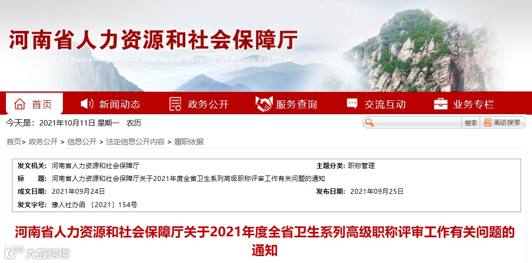 2021年9月25日,河南省人力资源和社会保障厅官网发布的《关于2021年度全省卫生系列高级职称评审工作有关问题的通知》,列出了八条能力业绩评审条件,并强调:坚持德才兼备、以德为先,坚持实践导向、科学评价,突出实践能力业绩导向,破除唯论文、唯学历、唯奖项、唯“帽子”等倾向。