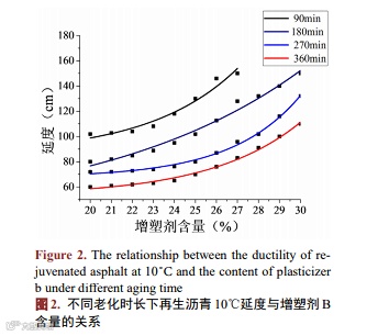 首先通过对老化沥青的组分和性能分析,结合再生剂的研制目标,选择了四种再生剂原材料;然后基于10℃延度,通过正交试验确定了再生剂的最佳配方为基础油A:增塑剂B:添加剂C:石油树脂D=100:30:3:1。在此研究的基础上,建立了沥青老化时长与10℃延度的函数关系,以及再生沥青延度与再生剂中增塑剂B含量的函数关系。研究结果表明: