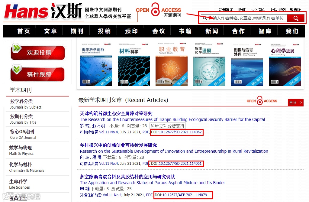 如果在我们出版社发布的文章,你只知道文献的DOI,那也可以在我们汉斯出版社官网(https://www.hanspub.org/点击“阅读原文”即可直接进入官网)输入DOI检索后下载文献。