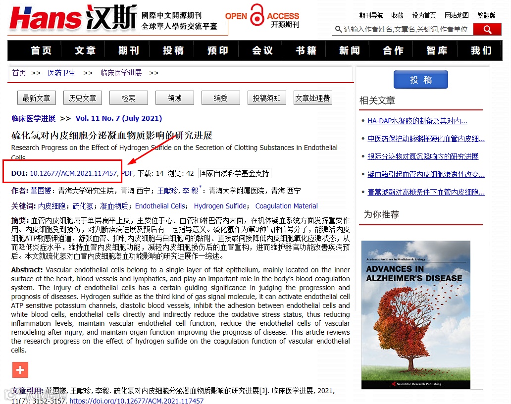 就比如我们汉斯出版社,DOI: 10.12677/ACM.2021.117457