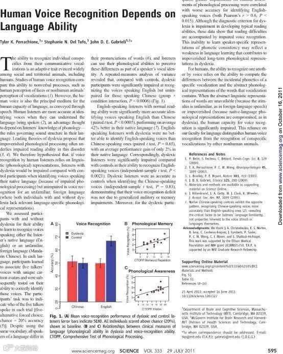 刊登在Science上的这篇文章,题目为《Human Voice Recognition Depends on Language Ability》(2011年7月29日),作者是美国麻省理工学院(MIT)的三位研究人员。