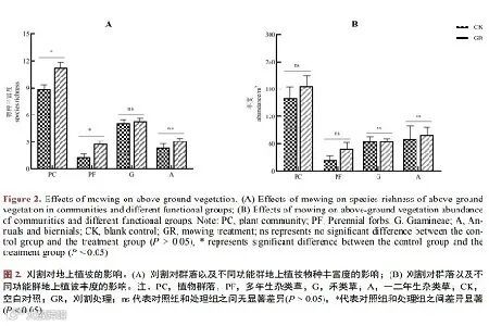 研究发现,群落物种丰富度的变化主要是由多年生杂类草导致的,是因为刈割能够降低群落优势 种植物的盖度,为杂类草的繁殖创造机会,进而提高植物多样性,此外刈割还能够通过改变群落环境、 土壤理化性质而影响和改变群落结构。