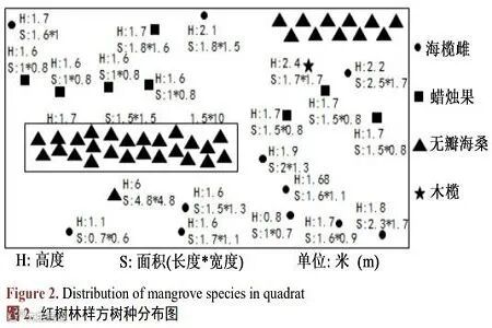 通过使用无人机航拍,在红树林区域中,无瓣海桑、蜡烛果、海揽雌、木榄为主要树种。无瓣海桑群落主要分布在区域中部以及西北部,在四个优势树种中高度最高并且占据面积最大,面积约为12,430m2;蜡烛果群落主要分布在红树林区域四周边缘,面积约为6464m2;海揽雌群落主要分布在红树林区域中部及西南部,面积约为5160m2;木榄群落分布在西南部,面积最小,约为1184m2。