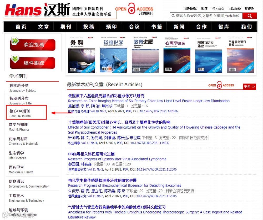 以汉斯出版社为例,在汉斯出版社官方平台里,所有期刊都是OA期刊,官网上的所有文献均可开放获取!