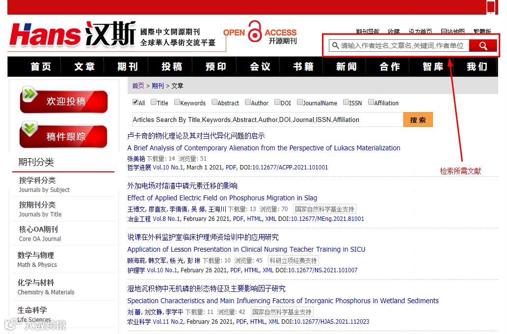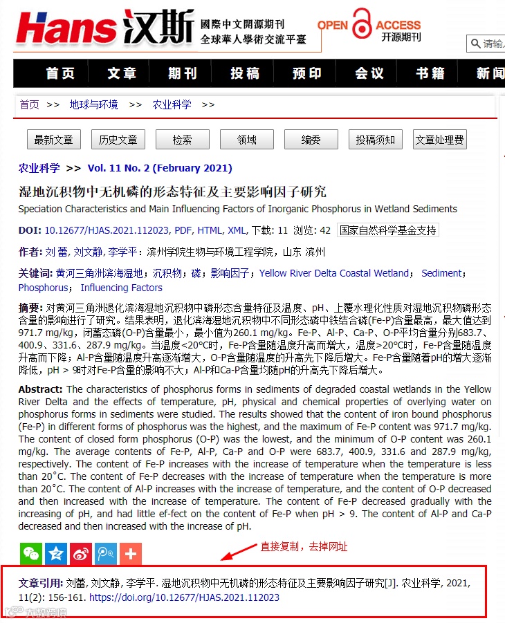 最后告诉大家一个小tips,为方便广大作者引用参考文献,汉斯出版社官网上的每一篇期刊论文都有调整好的参考文献格式,你只需在官网找到你所需的参考文献,点开文章直接复制到你的论文就ok啦!