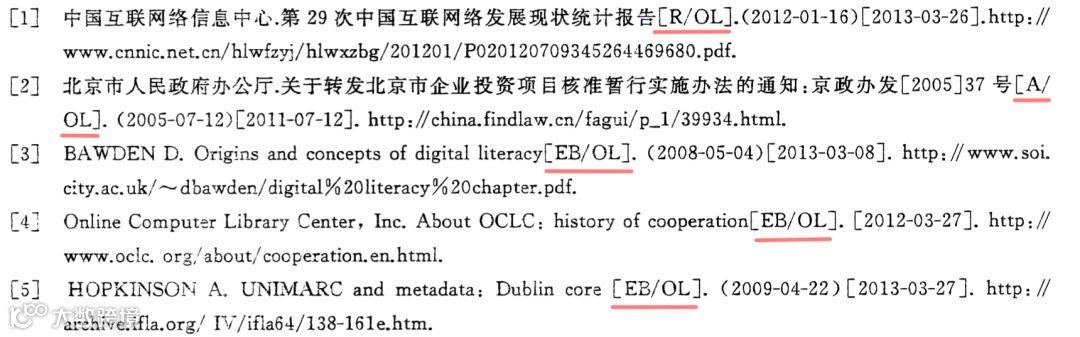 就电子资源的完整代码[文献类型标识/文献载体标识]而言,最常用的应该就是[EB/OL]了,即网上电子公告(electronic bulletin board online)。
