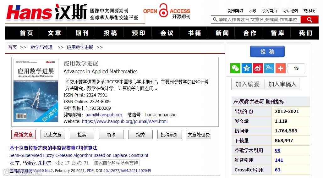 《应用数学进展》是一本关注应用数学领域最新进展的国际中文期刊,主要刊登数学的各种计算方法研究,数学在统计学、计算机等方面应用的学术论文和成果评述。