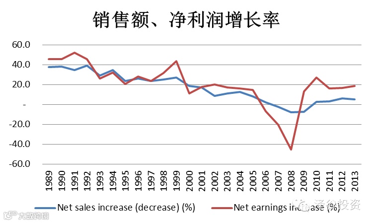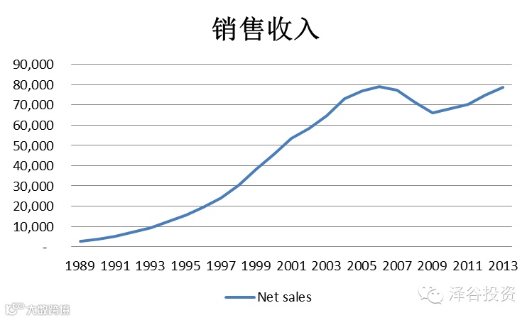 自上市以来能够查到的财务报表来看,1989年公司销售收入27亿美金,2013年公司销售收入788亿美金,25年间销售收入增长29倍;
