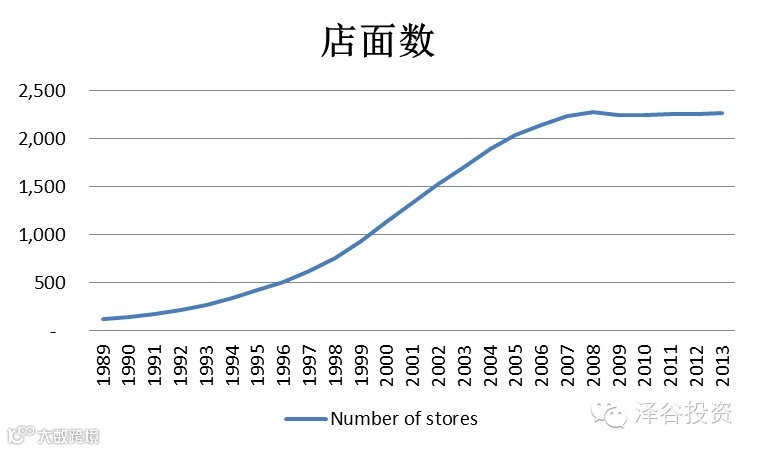 店面数自1989年的118间,增加至2013年的2263间,25年间增长19倍。绝大多数店面位于美国境内。在金融危机发生后的几年中,店面数没有再大规模扩张,基本保持稳定。