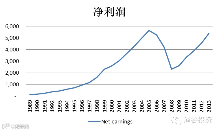 自1989年以来,年年盈利,从未亏损,净利润从1989年的1.12亿美金,增长至2013年的53.8亿美金,25年间净利润增长48倍,只在金融危机期间出现过下滑,却又很快强势反弹;