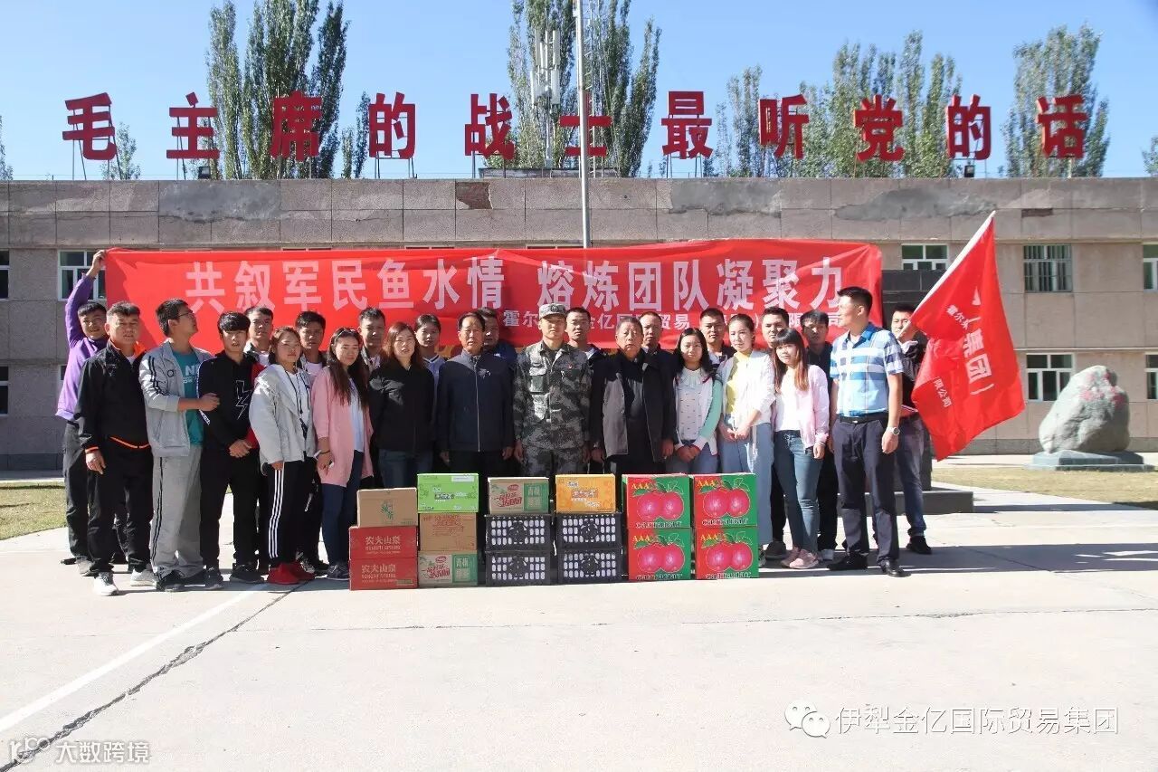 活动第一站便是阿拉马力边防连,我们倾听了阿拉马力边防连战士的介绍,阿拉马力边防连位于新疆霍城县西北距霍尔果斯口岸不远的卡拉乔克山下,1962年建站时,连队官兵依靠“三峰骆驼一口锅,两把铁锹住地窝”的简陋条件,没有住房掏地窝,没有吃的挖野菜,在光秃秃的荒山上建起了这个美丽的哨所。让我们到了边防战士的守卫边疆的艰辛及这种保家卫国的决心,金亿集团同时也为为边防战士送去了水果、饮料等慰问品,感谢广大边防官兵舍小家、为大家,驻守在边境一线,为国戍边。