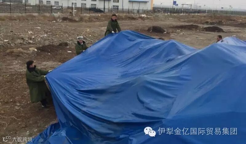 在进口甘草区域开始了篷布“大战”。厚厚的篷布拉起来极其费力,在五位男同志们的团结协作下,终于盖上了篷布并捆绑结实。