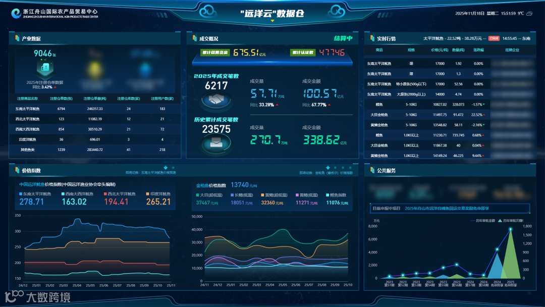 自2022年初正式上线运营以来,浙农中心在各级党委、政府的关心和支持下,依托舟山远洋渔业特色产业集群优势,打造集在线贸易、数字仓储、金融配套、数据信息等功能于一体的大宗农产品产业互联网平台,形成挂牌、预售、竞价等交易模式,目前注册用户来自全国28个城市达1135家,上线农水产品38个,累计交易额339亿元,在线结算资金676亿元,其中金枪鱼交易量占全国的42%,鱿鱼交易量占全国的60%。